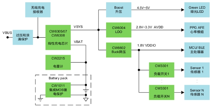 隨著技術(shù)的飛速發(fā)展,智能指環(huán)作為新興智能可穿戴設(shè)備越來(lái)越被品牌廠商所關(guān)注。中國(guó)穿戴廠商華米在CES 2024期間發(fā)布了名為Helio Ring的智能指環(huán)新品;韓國(guó)三星電子于2024年7月正式發(fā)售指環(huán)產(chǎn)品Galaxy Ring,市場(chǎng)反響熱烈。智能指環(huán)既有裝飾潮品的時(shí)尚屬性,又是智能手機(jī)的輔助智能感知配件,用于人體健康數(shù)據(jù)的監(jiān)測(cè)。相比手表和手環(huán),指環(huán)更貼合皮膚,因此在收集人體基礎(chǔ)生物信息,如脈搏、心率、血氧、心電圖,以及監(jiān)測(cè)體溫等方面更有精準(zhǔn)度優(yōu)勢(shì)。指環(huán)相比智能手表,還有無(wú)感佩戴的特點(diǎn),更能滿足用戶的差異化需求。智能指環(huán)受限于空間尺寸,配備的鋰電池容量通常在15~23mAh,而續(xù)航時(shí)間則需要達(dá)到5天或更久。因此,超低功耗且超小尺寸的芯片必為產(chǎn)品開(kāi)發(fā)者所青睞。賽微微電(CellWise)已經(jīng)量產(chǎn)多款超低功耗的小尺寸電源芯片,如Figure1所示,都非常適用于智能指環(huán)應(yīng)用。Figure 1.智能指環(huán)電源方案線性充電器-CW6308、CW6305/6307CW6308是一款支持I2C接口和電源路徑管理的線性充電芯片,尺寸為業(yè)內(nèi)最小,充電電流最大支持320mA。在僅有電池供電并開(kāi)啟Watchdog功能后,芯片工作電流仍低至5μA。CW6308還支持500nA超低功耗模式和300nA船運(yùn)模式,封裝為WLCSP-9,尺寸為1.24mm*1.24mm。CW6305/6307功能與CW6308一致,區(qū)別是可支持最大470mA充電電流,芯片封裝尺寸為WLCSP-9,1.55mm*1.55mm。電量計(jì)-CW2215單節(jié)鋰電池電量計(jì)CW2215的工作電流僅為5μA,是業(yè)內(nèi)最低,內(nèi)置高精度ADC,支持電壓、電流和溫度監(jiān)測(cè)。芯片內(nèi)置“FastCali”算法,結(jié)合對(duì)客戶電池樣品建模測(cè)試提取的電池特征參數(shù),可完成對(duì)電池剩余電量(SOC)、循環(huán)數(shù)(Cycle)和電池健康(SOH)的精確計(jì)算,并可配置對(duì)低電量、高溫或低溫的情況進(jìn)行中斷上報(bào)。CW2215為WLCSP-9封裝,尺寸為1.58mm*1.53mm。LDO低壓差穩(wěn)壓器-CW6004CW6004是一款超低功耗LDO,靜態(tài)工作電流低至300nA。其輸入電壓1.6V~5.5V,輸出電壓有1.1V, 1.2V, 1.5V, 1.8V, 2.5V, 2.8V, 3.0V和3.3V可選,輸出電流為200mA。CW6004具有快速的動(dòng)態(tài)響應(yīng)特性,當(dāng)設(shè)備從Standby輕載快速切換到Active重載的工作場(chǎng)景下,VOUT輸出電壓也能保持穩(wěn)定。該芯片為DFN-4封裝,尺寸為1.0mm*1.0mm。Figure 2.  CW6004靜態(tài)電流vs輸入電壓Figure 3.  CW6004 Ground電流vs 輸出電流Buck降壓轉(zhuǎn)換器-CW6602、CW6603CW6602是一款超低功耗Buck降壓轉(zhuǎn)換器,輸入電壓為2.15V~5.5V,輸出電壓為1.2V~3.3V共8檔可選。其靜態(tài)工作電流低至330nA,負(fù)載電流能力為0.6A/峰值電流1.0A。在1.8V輸出電壓時(shí),芯片的重載效率達(dá)90%以上,100uA輕載的效率也可達(dá)85%。該芯片具有快速的負(fù)載動(dòng)態(tài)響應(yīng)能力,封裝為WLCSP-8,尺寸為1.575mm*0.825mm。CW6603的功能和尺寸與CW6602一致,區(qū)別是輸出電壓范圍為0.6V~1.2V。Figure 4.CW6602 Vout=1.8V的轉(zhuǎn)換效率負(fù)載開(kāi)關(guān)-CW3301CW3301是一款超低MOS導(dǎo)通電阻的負(fù)載開(kāi)關(guān),輸入電壓為1.1V~5.5V,最大通流能力2.0A。芯片的輸出電壓擺率(slew-rate)受控,有效保護(hù)后級(jí)芯片;CW3301具有業(yè)內(nèi)領(lǐng)先的5nA On-State靜態(tài)工作電流和12nA Off-state漏電流,并支持輸出快速放電可選;其封裝為WLCSP-4,尺寸為0.76mm*0.76mm。鋰電保護(hù)-CW1011CW1011為單節(jié)鋰電池保護(hù)芯片,支持高精度過(guò)壓、欠壓、充電過(guò)流、放電過(guò)流和短路保護(hù)。芯片內(nèi)部集成了54mΩ導(dǎo)通電阻的Dual MOSFETs;其靜態(tài)工作電流為2.5μA,并支持休眠模式,功耗低至20nA。CW1011的封裝為DFN-6,尺寸為2.0mm*1.5mm。賽微微電(CellWise)深耕超低功耗電源技術(shù)多年,在智能手表、TWS耳機(jī)、主動(dòng)手寫筆、無(wú)線藍(lán)牙鍵鼠等可穿戴設(shè)備和數(shù)碼配件上擁有眾多design wins。今天介紹的這些電源芯片,一定也可以助力各品牌廠商和方案開(kāi)發(fā)者,實(shí)現(xiàn)智能指環(huán)的更小空間堆疊、更長(zhǎng)電池續(xù)航和更優(yōu)用戶體驗(yàn)。感謝大家對(duì)賽微微電公司和產(chǎn)品的持續(xù)關(guān)注。